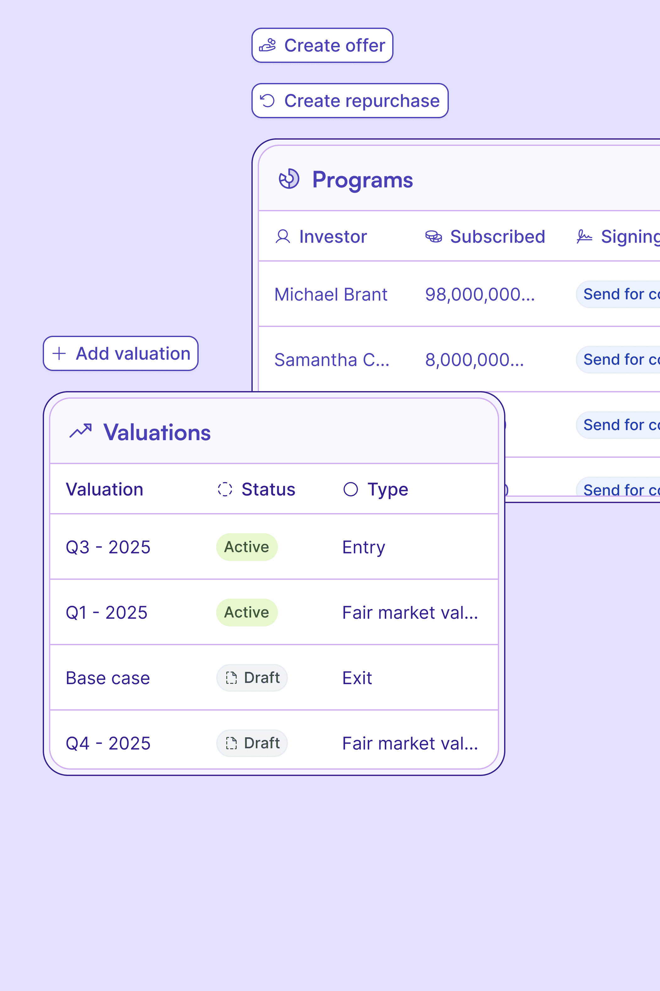 Simplify the setup, management, and monitoring of equity programs with a single platform. Efficiently handle joiners, leavers, pro-rata offers, valuations etc. through purpose-built workflows, integrated with DocuSign. Grant access to fund professionals, company management, and advisors to ensure your programs run smoothly.